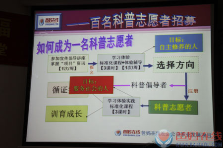 此次项目的目标是为科普志愿者队伍提供职业化服务,加强科普倡导者群体的精神文明建设和社区科普支持系统的基地系统建设。该项目的第一步是对百名科普志愿者的招募。