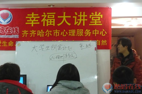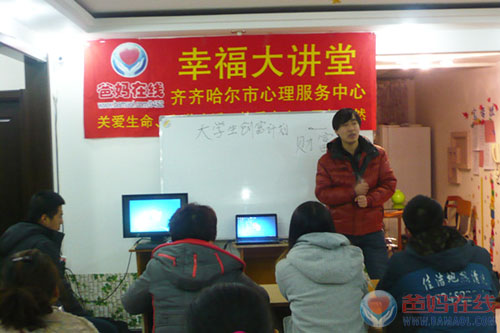 2013年1月27日晚六点半,在爸妈在线齐齐哈尔市心理服务中心,举办了爸妈幸福大讲堂——大学生创富计划说明、培训会。在校大学生和家长等尽二十人参加了讲座。