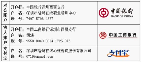6、工作坊(六天):爸妈在线终身心理工作者:700元/人;爸妈在线普通成员:800元/人;爸妈在线心理学爱好者:1000元/人;非爸妈在线成员:4800元/人;(此费用含会议费、资料费等,不含食宿费)。