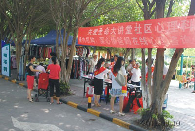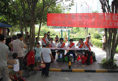 10日早上9点钟,爸妈在线心理咨询中心咨询师们来到位于福田区中心的福华村小区,社区主任和保安队长热情的接待了我们,并且安排小区的工作人员及时的搬来桌子,板凳,帮着系好横幅。他们以行动和热情欢迎我们到来,支持我们工作。