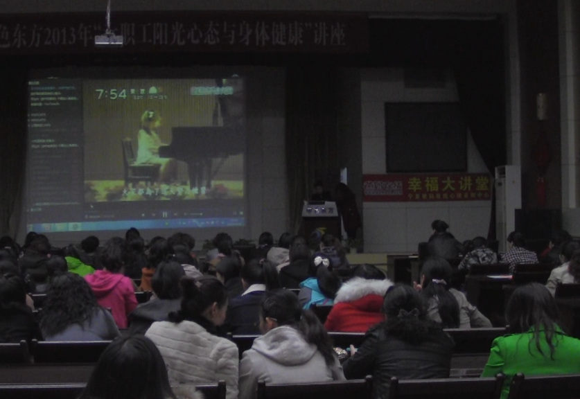 讲座一开始以互动形式开场,参加讲座220人分成四组,在王纪凤老师的引导下,4组分别做了“心有千千结”的互动游戏,在这个游戏当中员工们互相有了初步的了解,融入了当下的小团体。然后引入第一把钥匙:怎样改变心态,用实例和视频让员工们真切体会到阳光心态对自己生活的重要,怎样自然快乐,而不是强迫快乐。第二把钥匙:信念的力量,当你怀有怎样的信念,就会发生怎样的奇迹,用《水知道答案》的短片,让员工们了解:人就是一个空瓶子,装什么就是什么。当我们把阳光洒满心头,那么生活就会阳光灿烂。